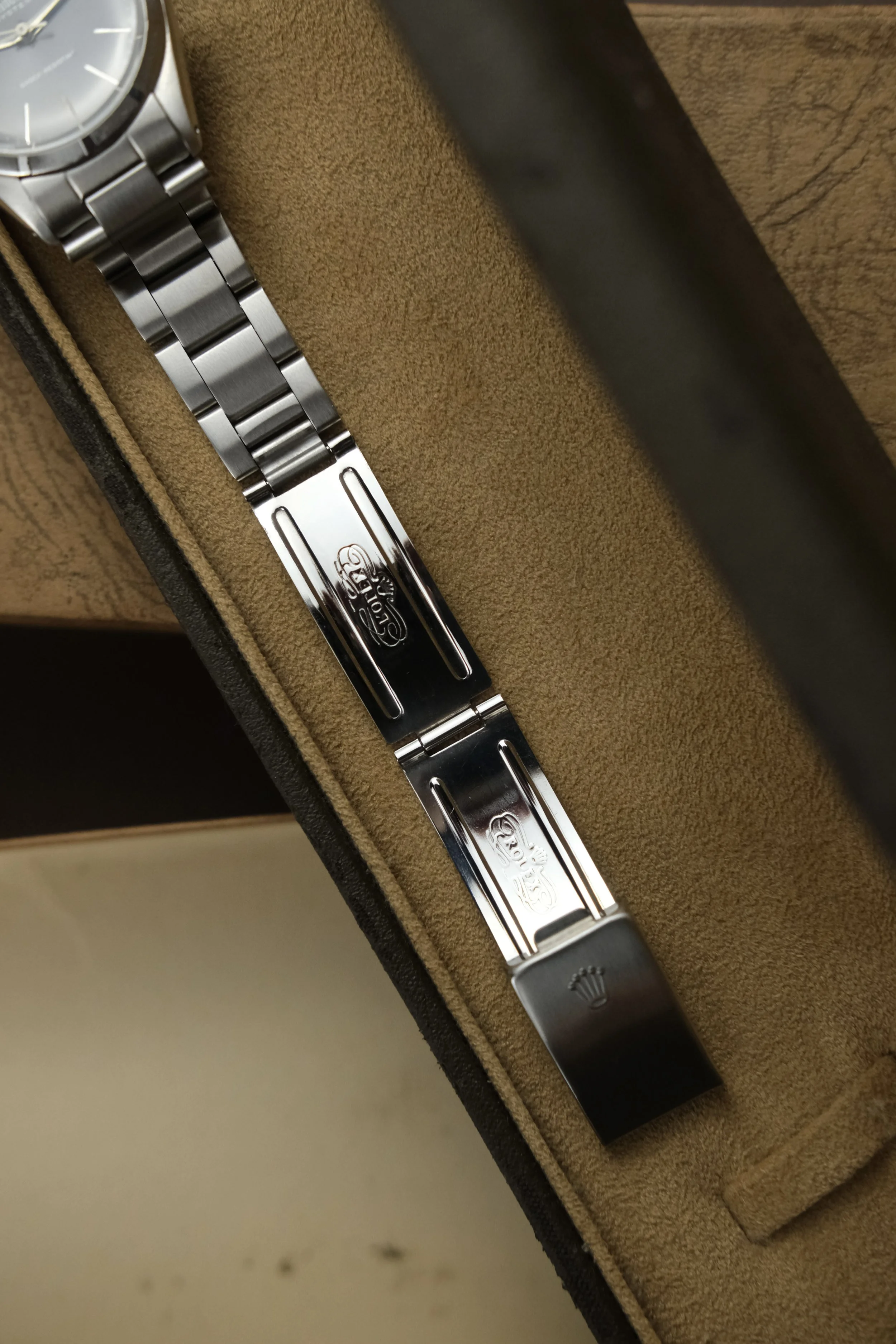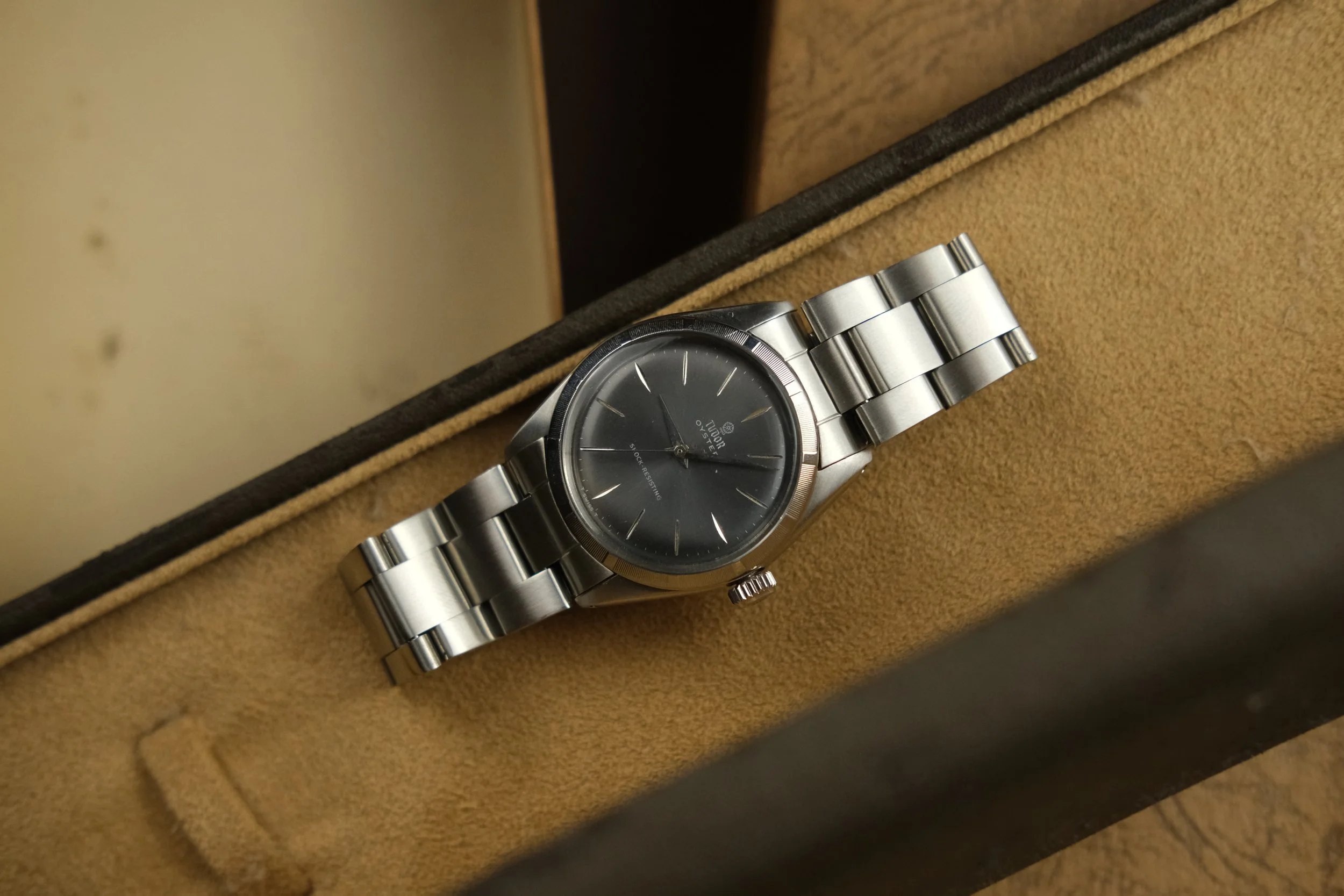 The Tudor Oyster is a remarkable vintage watch that beautifully captures the design ethos of the 1950s and early 1960s. The watch featured here is a Tudor Oyster (Shock-Resisting) with a distinctive striped bezel and a dark sunburst dial — details that help date it even without knowing the exact reference or serial numbers.