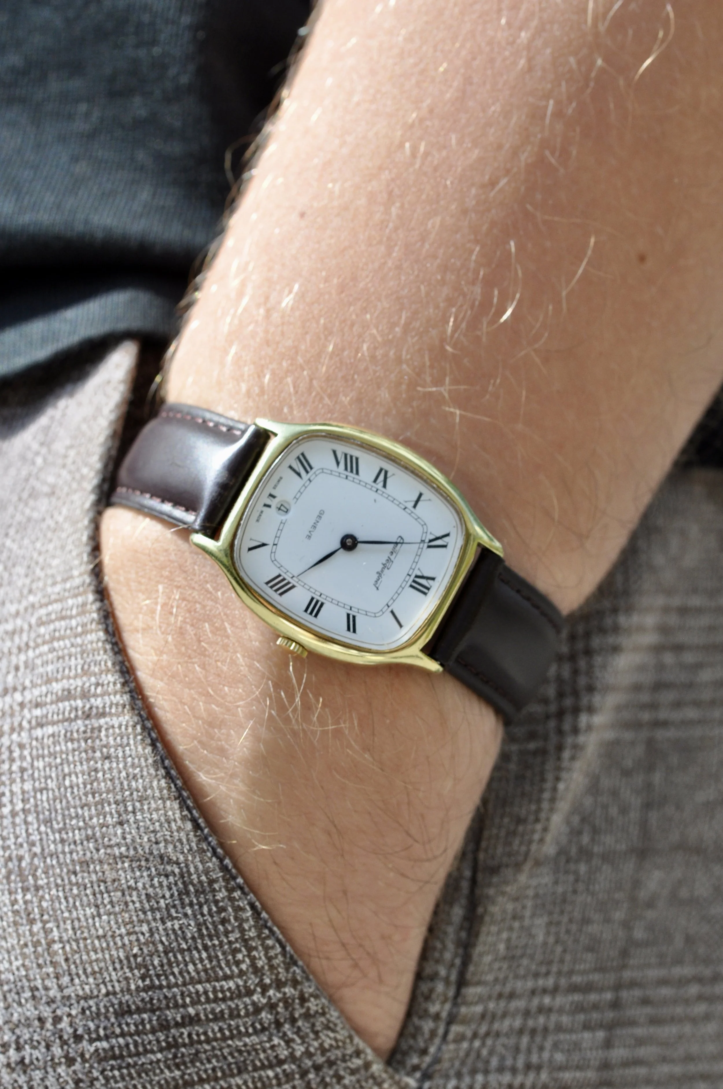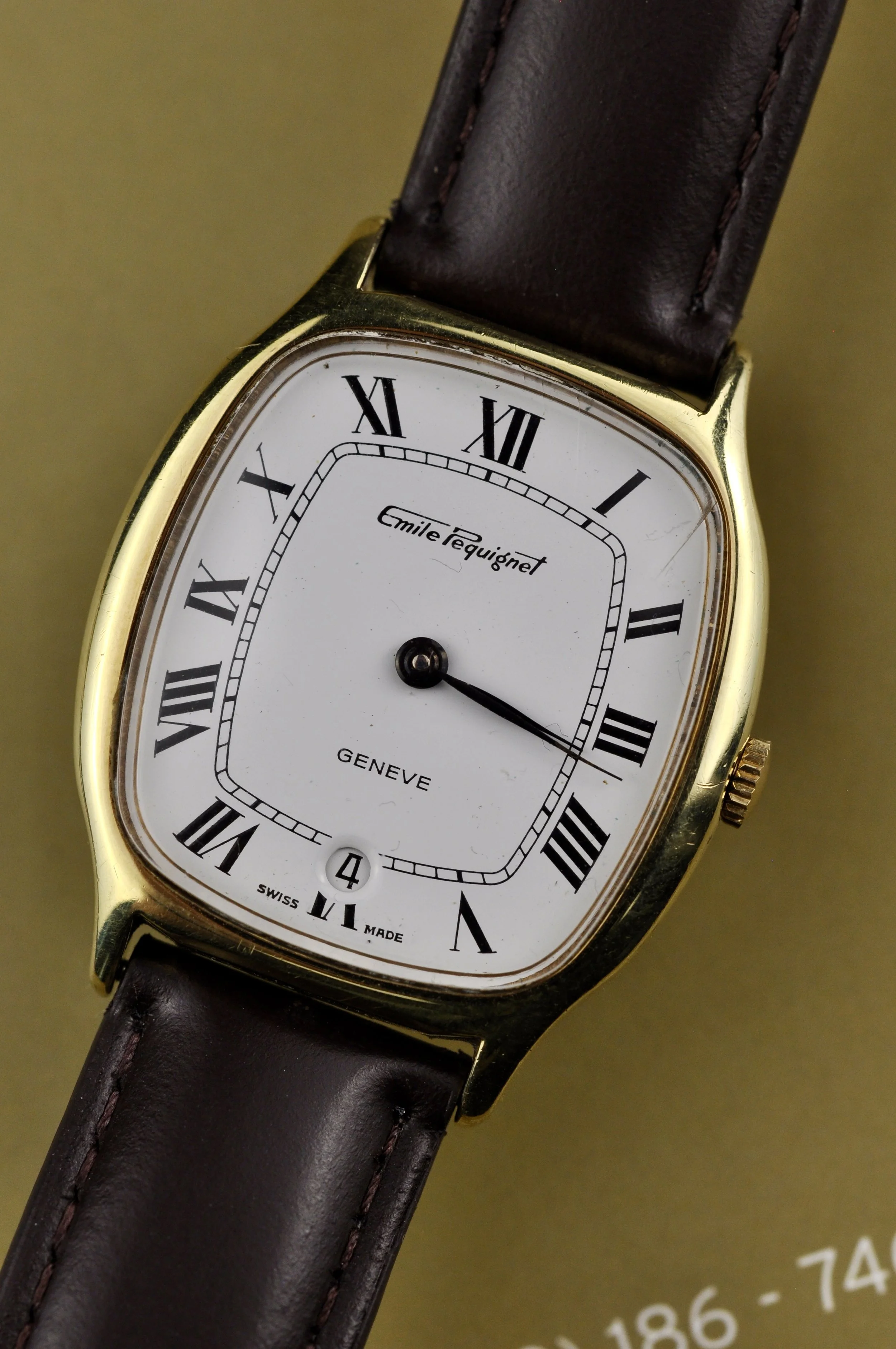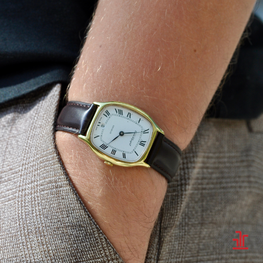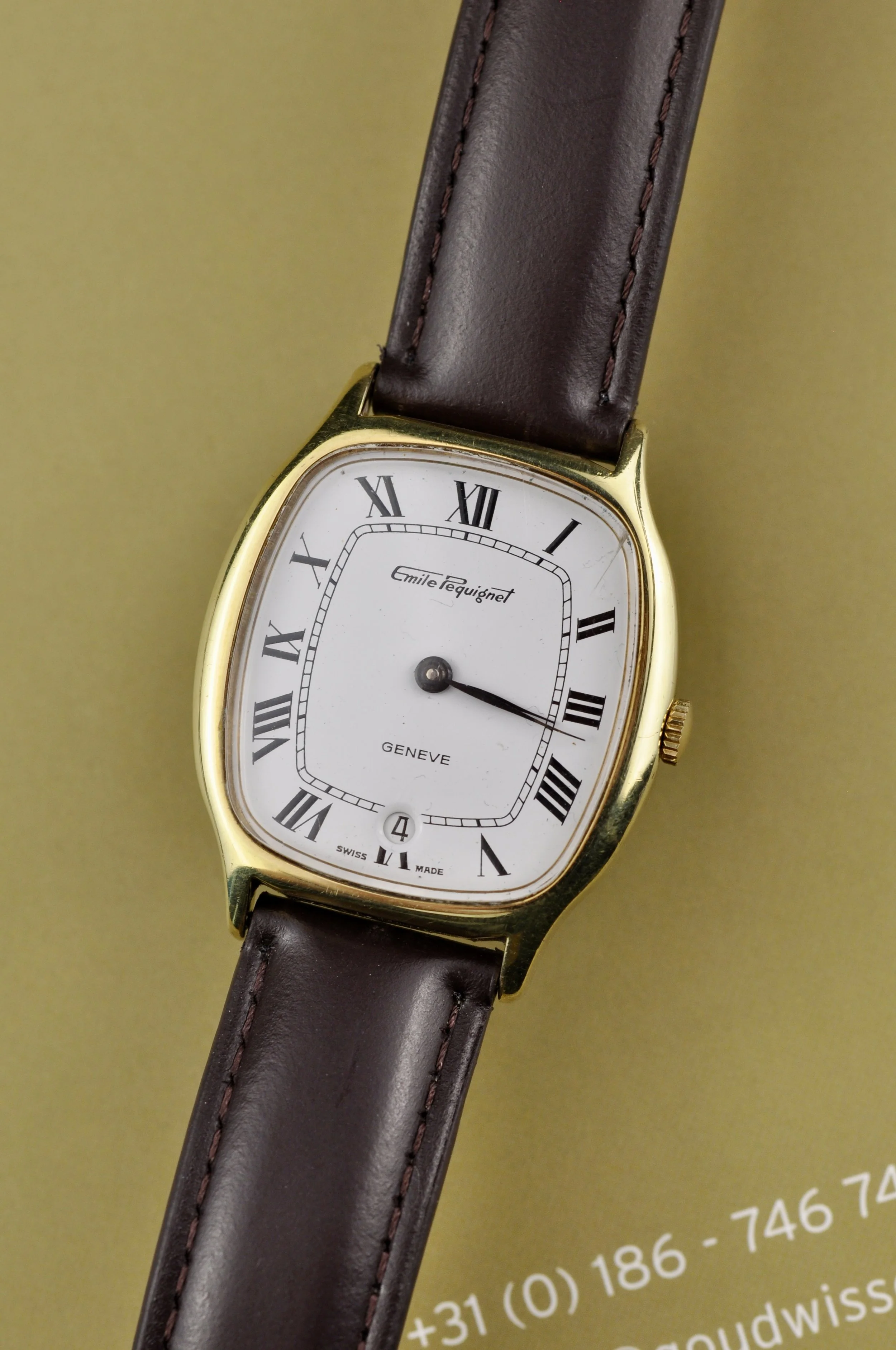 The Emile Pequignet Geneve reference number 10145 is a beautiful classic watch that perfectly combines craftsmanship and elegance. This timepiece features a hand-wound movement with 17 jewels, Swiss made, ensuring precision and reliability. The gold case, measuring 31x33mm, frames a white dial equipped with black Roman numerals that provide subtle contrast and excellent readability. At the 6 o’clock position, a date display adds functionality without compromising the sleek design. The brown leather strap with a matching gold buckle offers a comfortable and stylish wearing experience. This watch is a timeless choice for the true lover of classic timepieces.