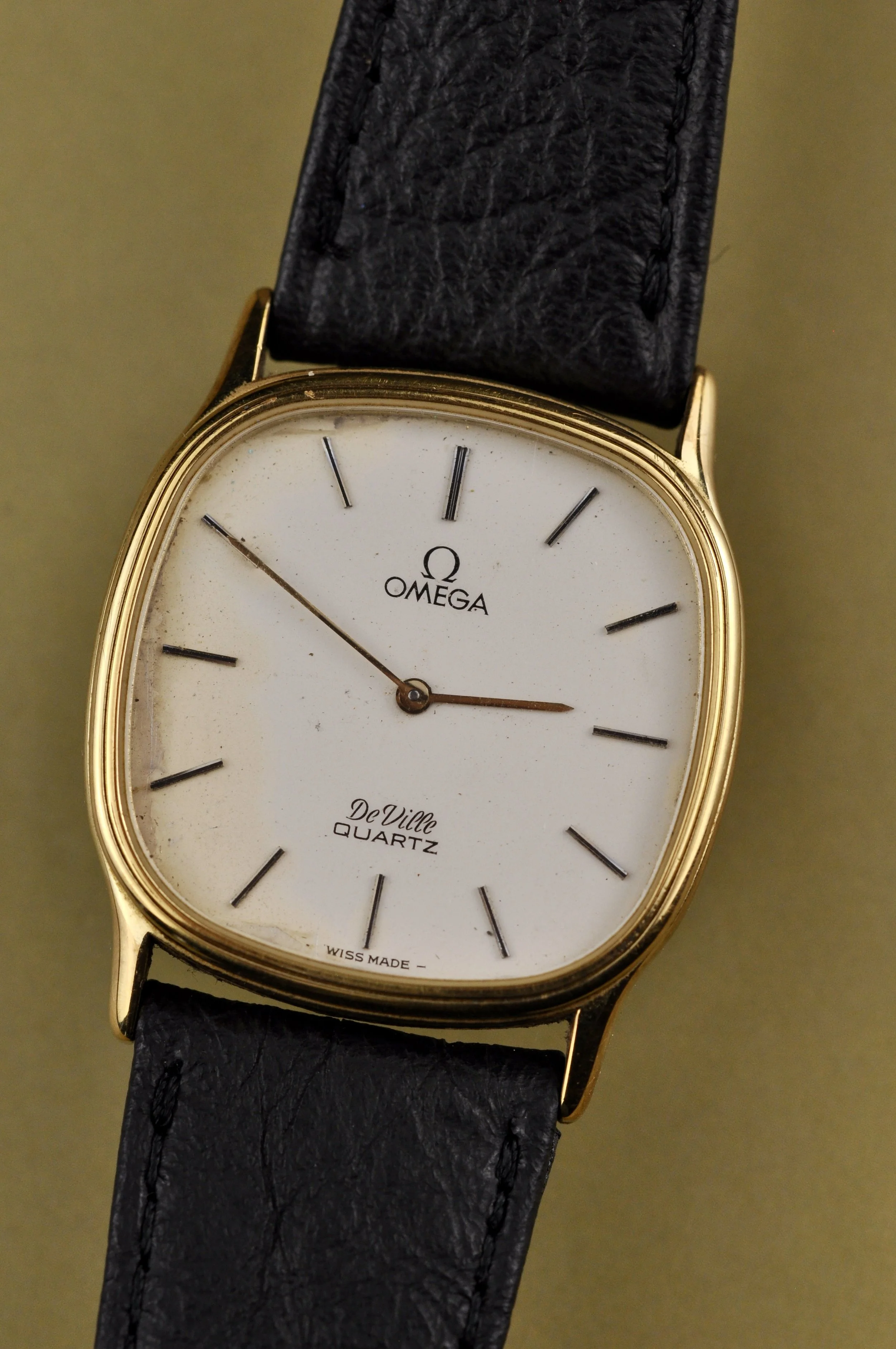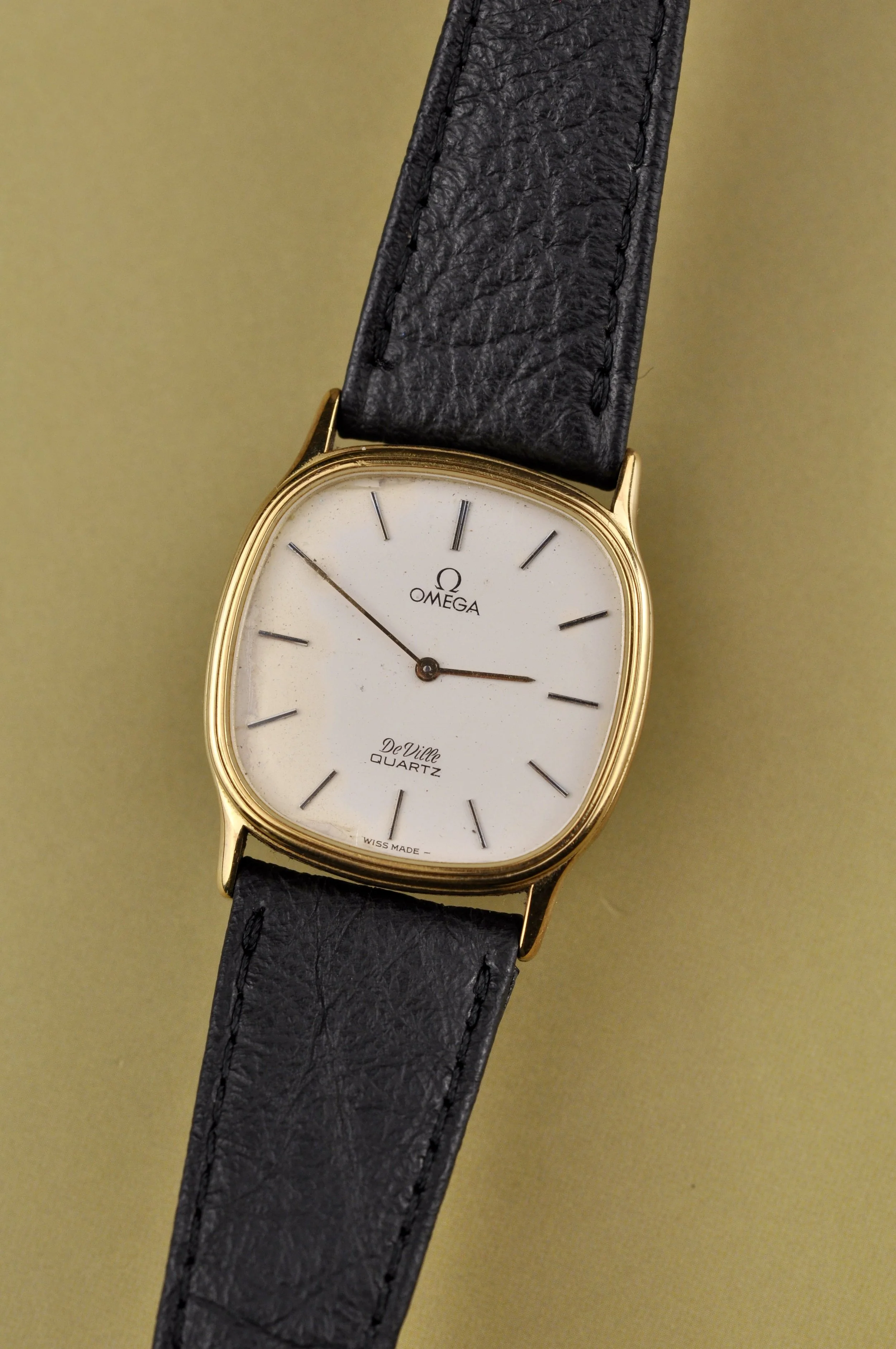 The Omega De Ville is a beautifully crafted timepiece that blends elegance and precision. Powered by a quartz 1365 movement with 9 jewels, this watch ensures reliable and accurate timekeeping. The watch features a push-in button mechanism, adding to its smooth operation and refined aesthetic. The gold case offers a luxurious touch, complemented by the grey dial and sturdy stainless steel back case. Paired with a genuine black leather strap and a gold buckle, the overall design harmoniously balances sophistication and comfort. Measuring 30x30mm, this watch is perfectly sized for those who appreciate subtle elegance. Reference number 191.0212.