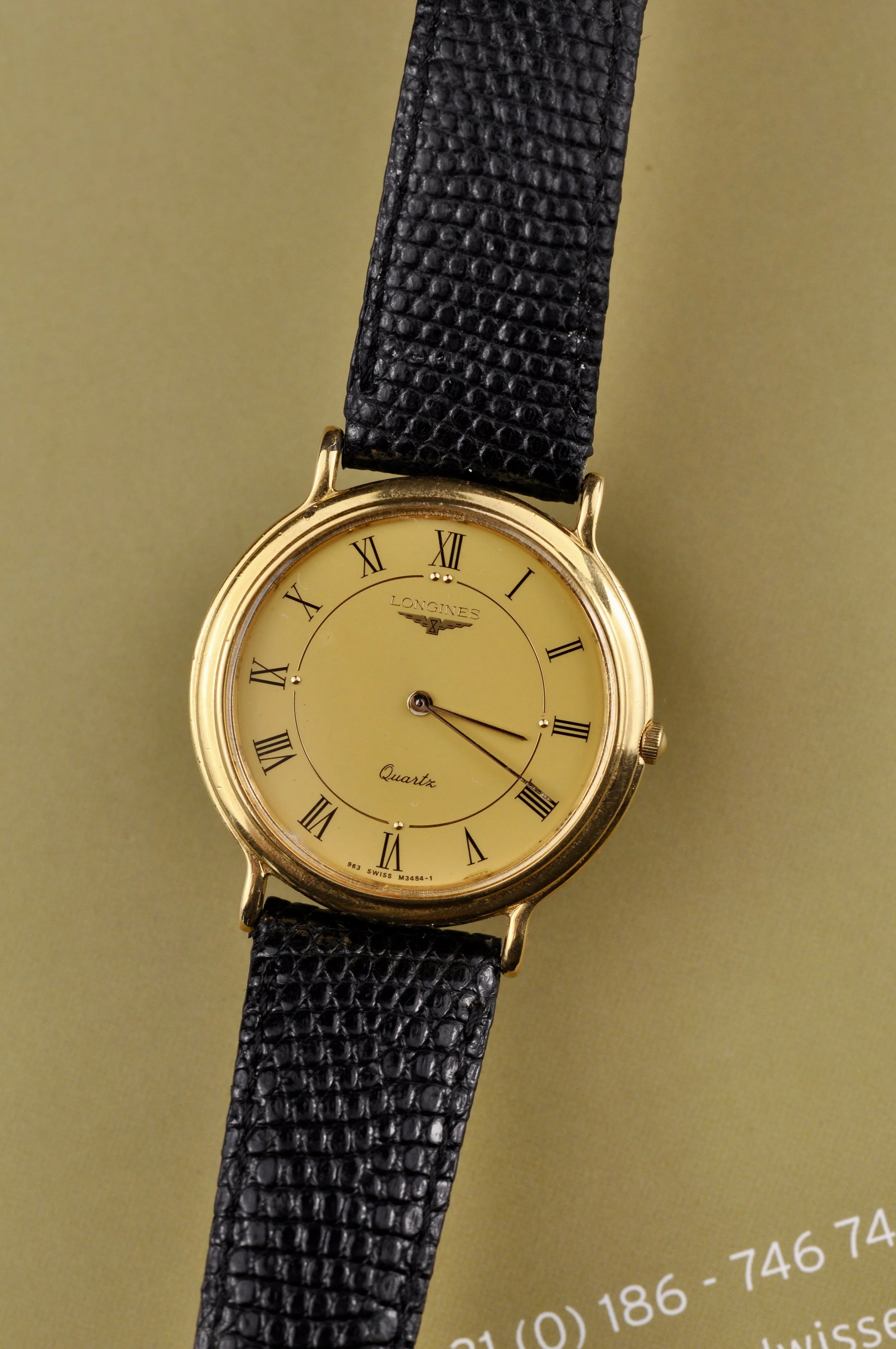 Discover timeless elegance with the Longines Flagship, a stunning quartz watch featuring the precise L963.4 movement. This watch boasts a sophisticated gold case paired with a durable stainless steel back case, ensuring both luxury and resilience. The golden dial is beautifully complemented by bold black Latin numerals, offering a striking yet classic look. Crafted with a genuine black leather strap from Bambi, the watch is finished with a matching gold buckle, enhancing its refined appearance. With a 32mm case diameter, this model is the perfect blend of classic style and standout presence, making it a remarkable addition to any collection.
